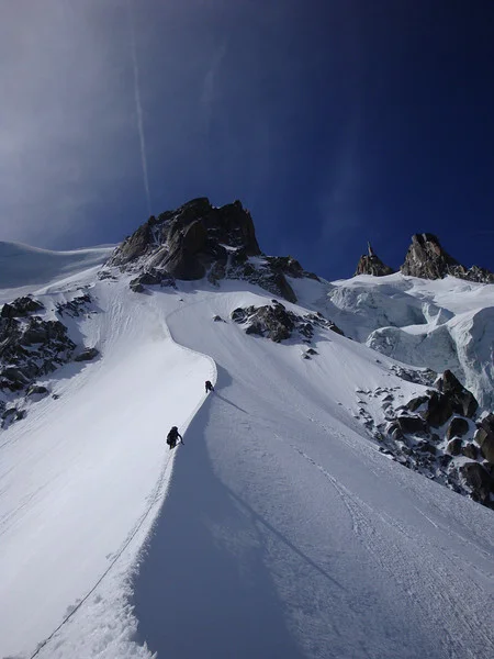 In the morning we suited up and got in line at the Aiguille du Midi telepherique station. I ran to a bakery for croissants and coffee while Kostas ran into the bushes to hide a sleeping bag, our sleeping pads, and our rock shoes in a last-minute ditching decision. Since we had already pre-ordained ourselves badasses, we figured we'd style the route in a day and a half, with a potential thunderstorm rolling in the next afternoon.