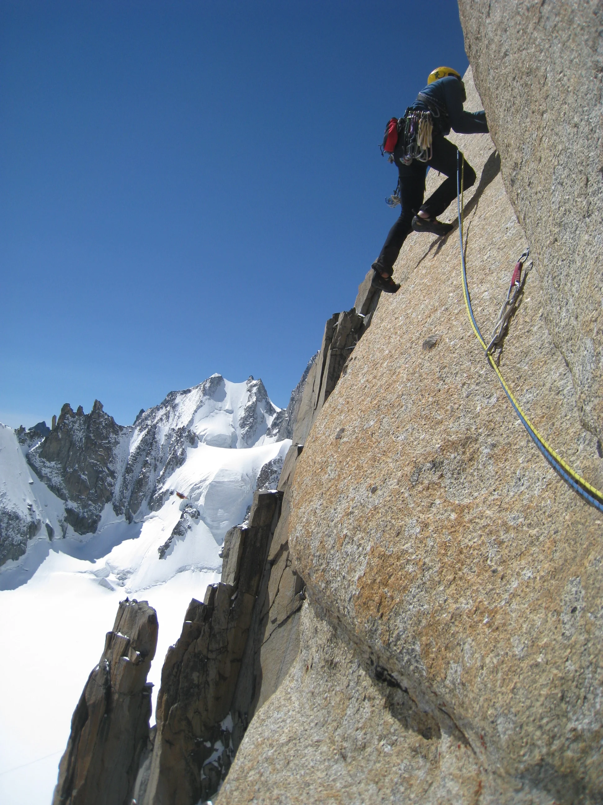 The climbing was phenomenal and we were strangely alone, apart from a party consisting of a guide and a client, a couple of pitches ahead of us. We caught up to them and politely inquired if they had any water. In an inimitable French accent, they politely but firmly responded that they only had 3 liters of it and apparently none to spare. We pushed on. The route masterfully follows the weaknesses up the face, as beautiful splitters alternate with delicate slabs. I slammed onto the wall a few times, as Enrico, around the corner and out of sight, was repeatedly whipping trying to free the crux pitch. A few demanding pitches of steep crack climbing brought us to the end of the route.